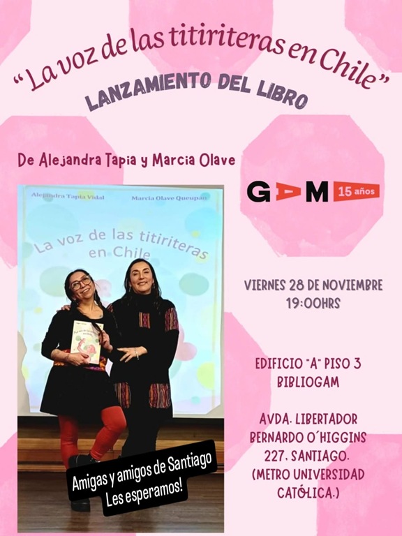 Este viernes 28 de noviembre en el Centro Cultural Gabriela Mistral GAM, se presenta el libro “La voz de las titiriteras en Chile”, de las autoras regionales Alejandra Tapia Vidal y Marcia Olave Queupan. La actividad con entrada liberada previa inscripción, está programada para las 19.00 horas.