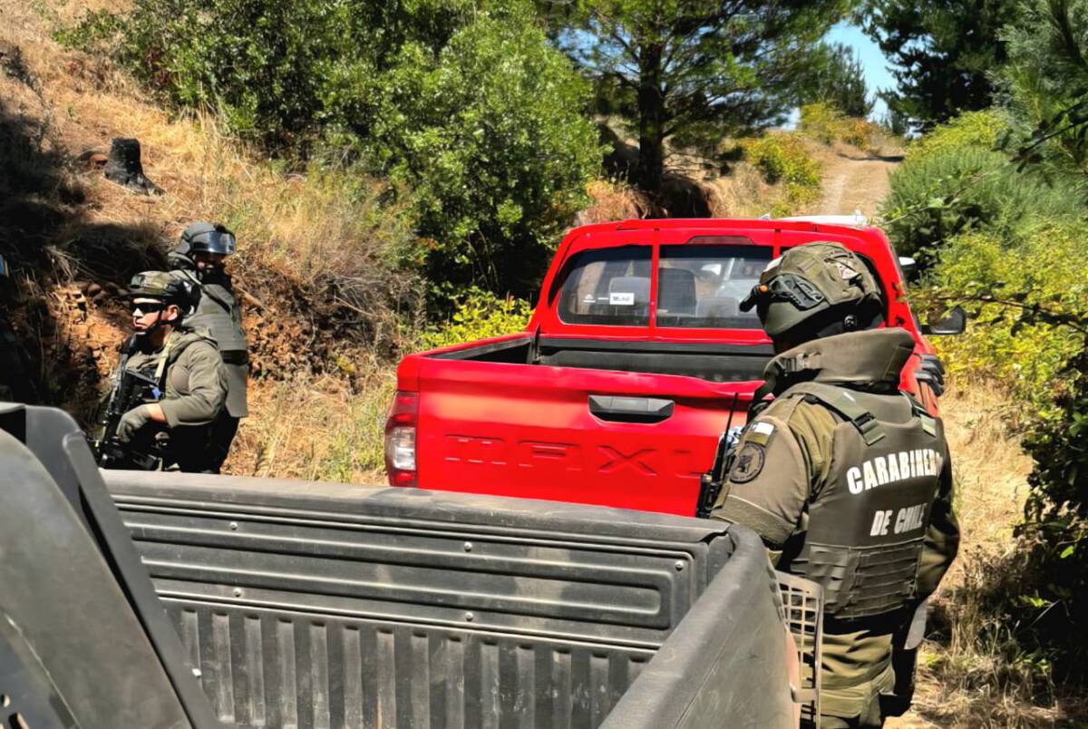 El vehículo, de marca Maxus modelo T-60, fue hallado oculto en la vegetación en el sector Chiguaihue en Ercilla, gracias al trabajo de esta zona especializada de Carabineros que opera en la macrozona sur del país.