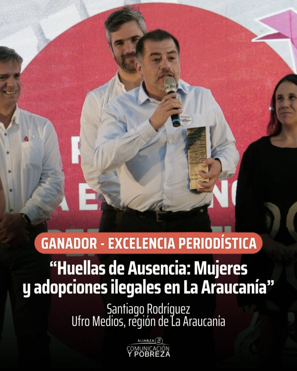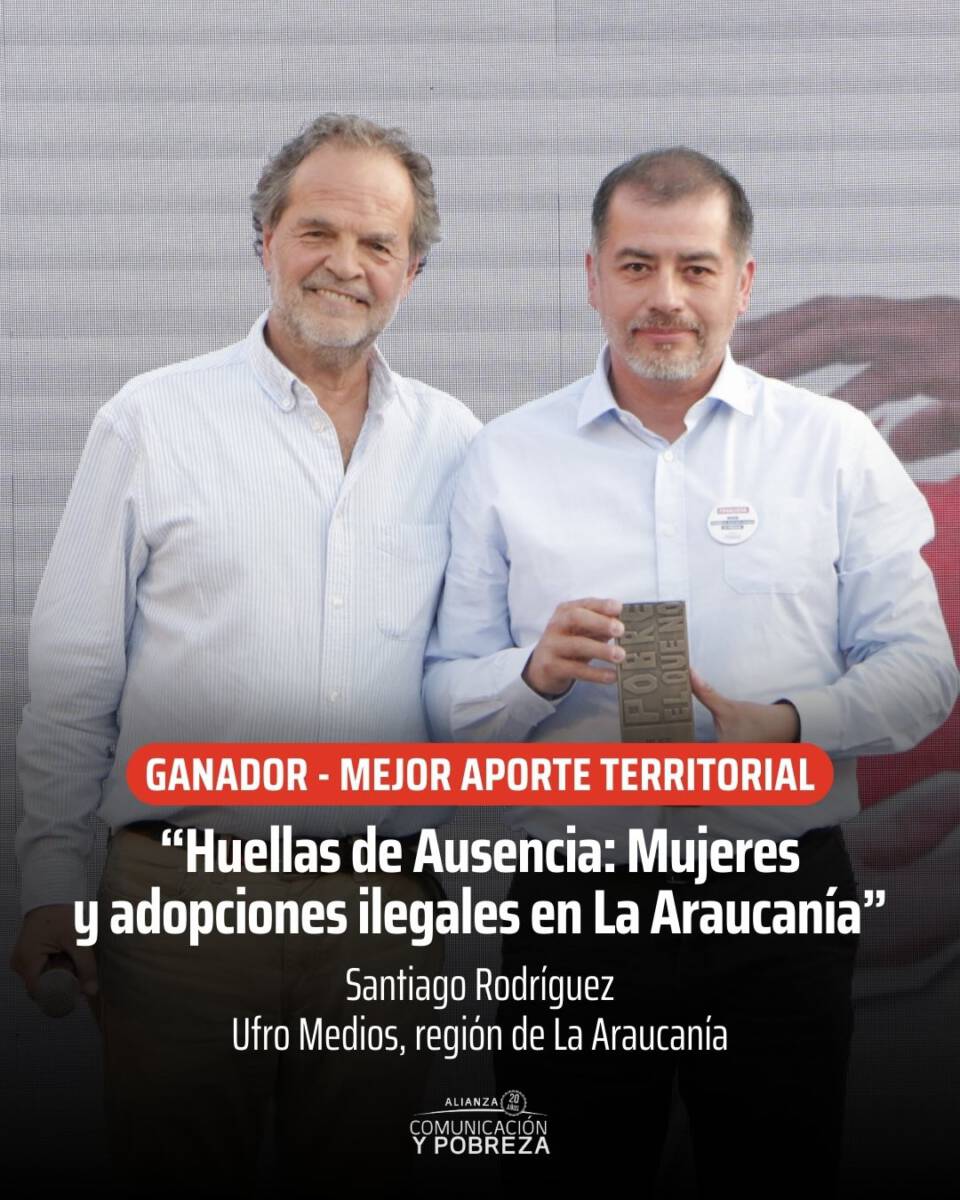 El documental “Huellas de Ausencia: Mujeres y adopciones ilegales en La Araucanía”, a través de su periodista Santiago Rodríguez, y con el respaldo de Ufro TV, fue reconocido con el Premio a la Excelencia Periodística del certamen “Pobre el que no cambia de mirada”, instancia de carácter nacional que busca destacar y valorar el trabajo de profesionales y medios de comunicación que, a través de sus contenidos, contribuyen a una cobertura responsable, ética y transformadora de la pobreza, la desigualdad y la exclusión social.