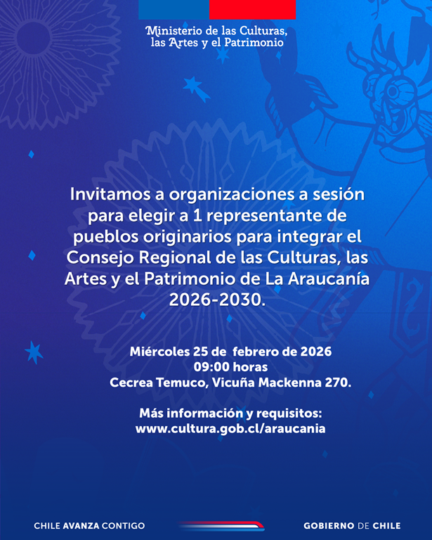 Como parte del proceso de constitución del Consejo Regional de las Culturas, las Artes y el Patrimonio de La Araucanía, la Seremi de las Culturas convoca a la sesión especial para la elección del consejero o consejera regional que representará a los pueblos indígenas de la Región de La Araucanía. Quien deberá contar con destacada trayectoria en los ámbitos de las artes, las culturas o el patrimonio, cuyo periodo de vigencia es 2026-2030